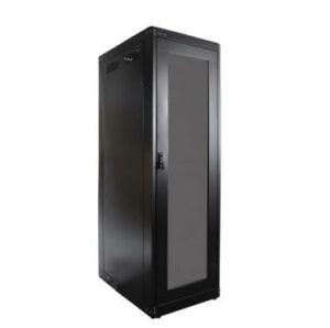 - Este bastidor inclui uma porta frontal em aço. A porta possui uma fechadura escamoteável para segurança. A porta traseira também é em aço, com fechadura escamoteável. As laterais são de aço e contam com fecho rápido, além de aletas de ventilação.